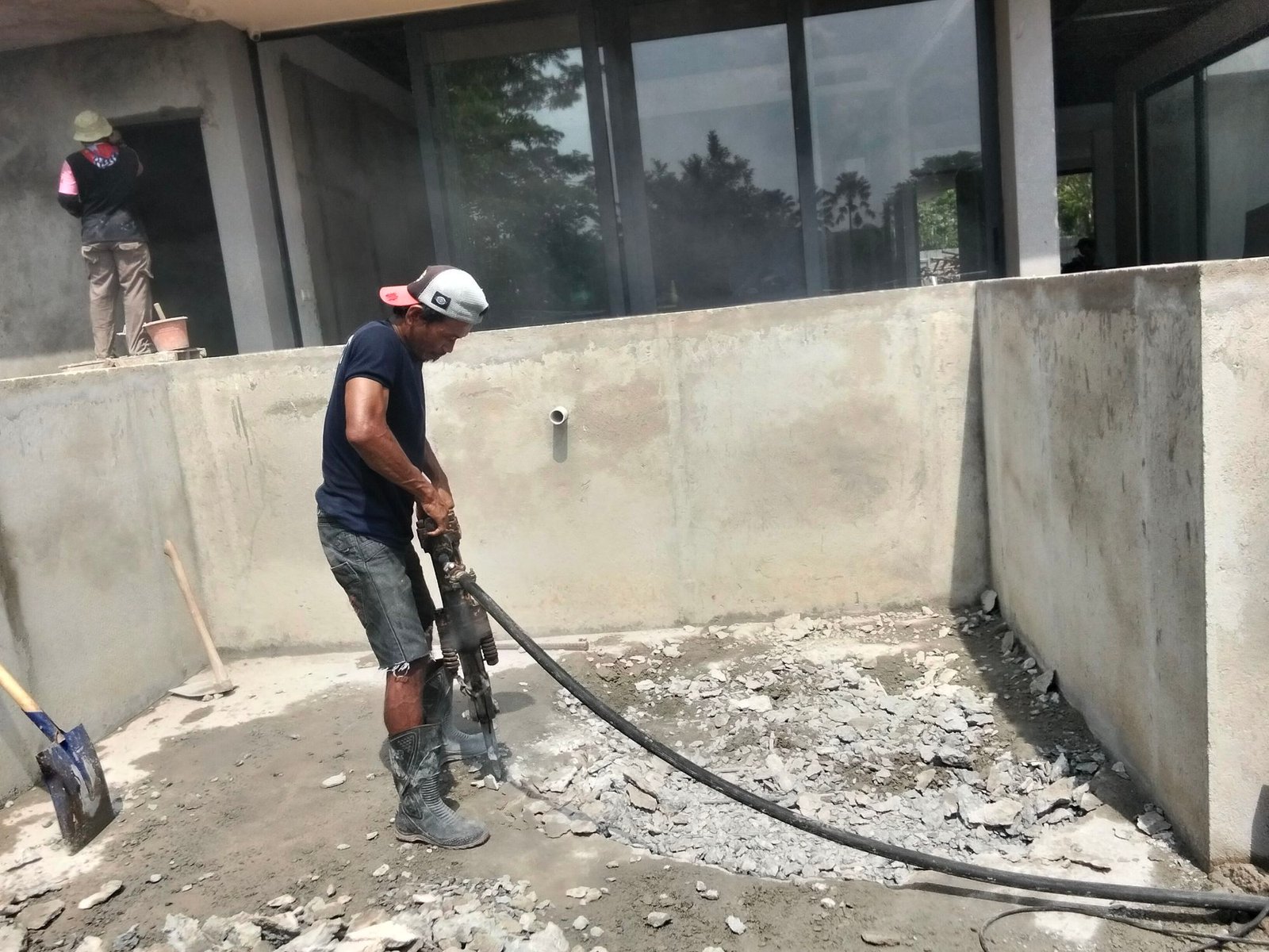 Setelah lapisan atas dihapus, saatnya untuk memecahkan beton pada lantai. Ini dapat dilakukan dengan menggunakan alat pemecah beton atau gergaji beton untuk membuat potongan-potongan kecil dan kemudian memecahnya lebih lanjut dengan palu besar atau alat lainnya. Pastikan untuk memecah beton menjadi bagian-bagian yang lebih kecil agar lebih mudah untuk diangkat dan dibuang.